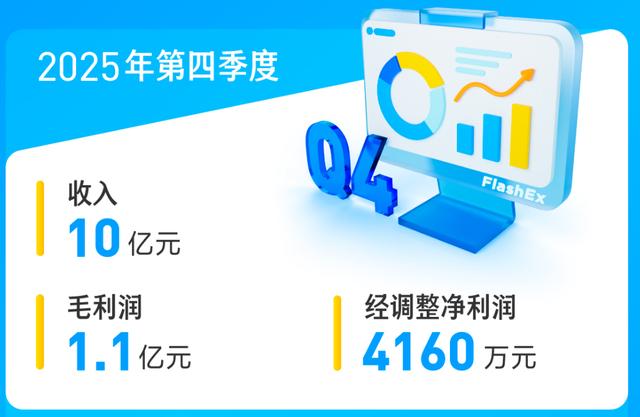 根据财报数据,2025年第四季度闪送延续稳健表现,单季营收保持在超10亿元的良好水平;盈利指标持续优化,毛利润同比微增约4.9%至1.1亿元,净利润、经调整净利润分别为2250万元、4160万元,亦较上年同期有所增长。