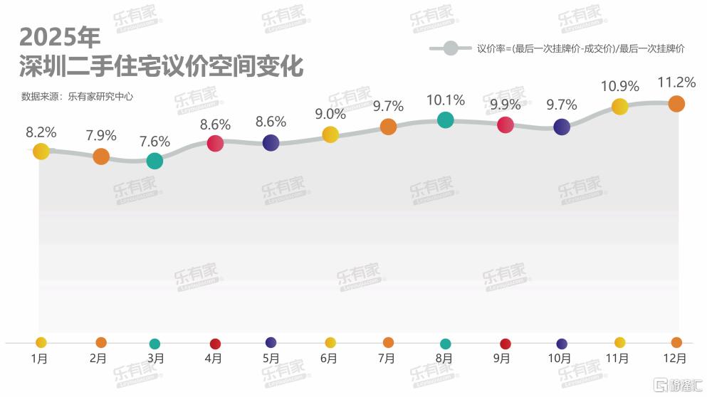 而2025年虽然相比2024年整体看,每月议价空间都有所缩减,但深圳二手房的议价空间,则从2025年1月的8.2%,上涨到去年12月的11.2%,为全年议价空间最高的月份。
