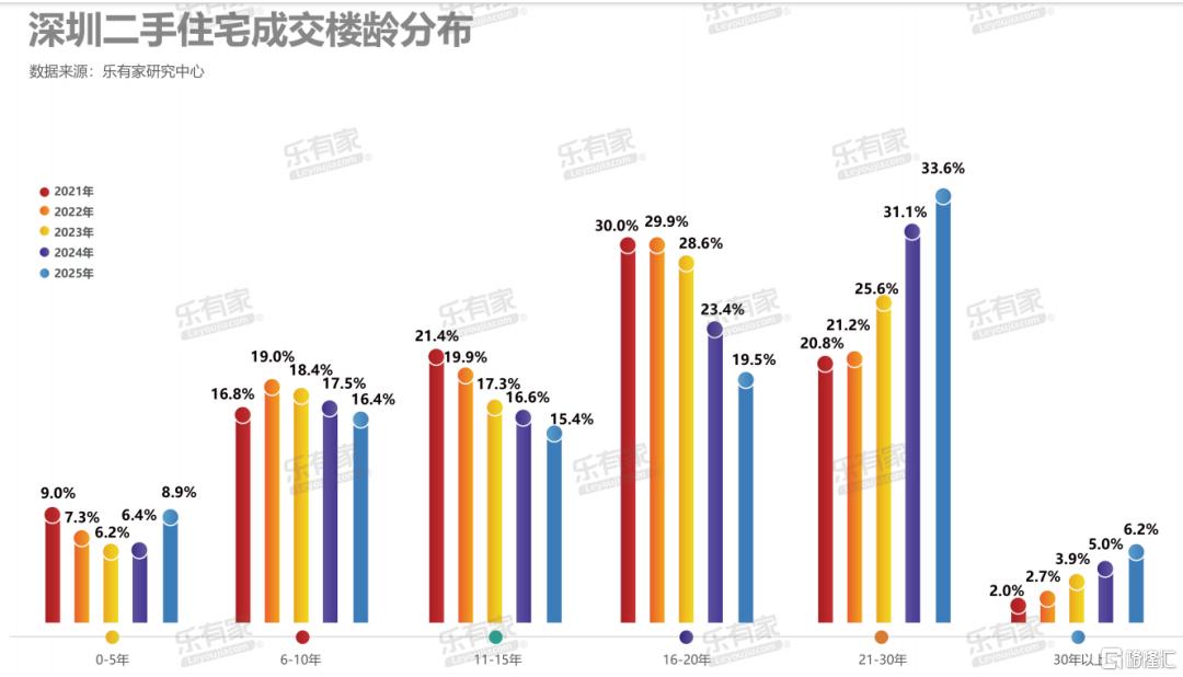 与此同时,近5年深圳21—30年的房子成交占比从2021年的20.8%,急速上涨到33.6%。