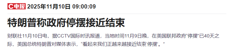盘前特朗普政府称停摆接近结束,最新消息是,美国国会参议院就结束美国联邦政府停摆达成一致。部分温和派民主党人同意在没有延长医疗保健补贴的情况下支持共和党的支出立法,从而迈出了结束政府停摆的第一步。