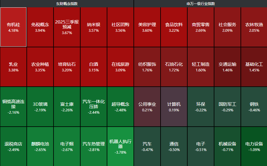 分行业来看,美容护理、食品饮料、商贸零售、社会服务、农林牧渔等行业领涨,电力设备、机械设备、电子等行业领跌。