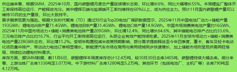 机构预计11月锂盐供应将延续稳步增长态势,但考虑到在动力与储能领域需求的强劲支撑下,市场已呈现显著去库存格局,预计短期锂价或震荡上行。