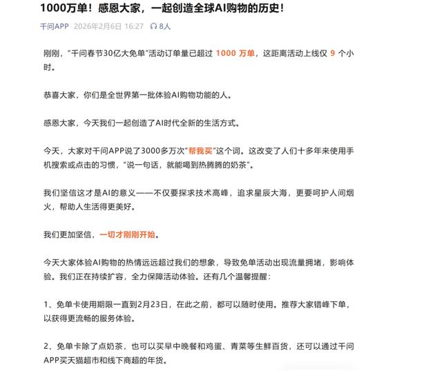 一时间,社交平台上似乎人人都在买奶茶,一度把千问干崩了,把奶茶店也干崩了。下午16时27分,千问通过公众号发布战报表示:千问春节30亿大免单”上线9小时,活动订单量已超过1000万单。