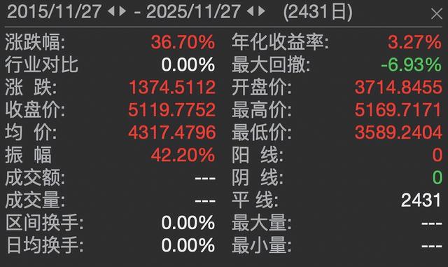 根据Wind数据,从2015年11月27日至2025年11月27日的十年间,该指数累计涨幅约36.7%。