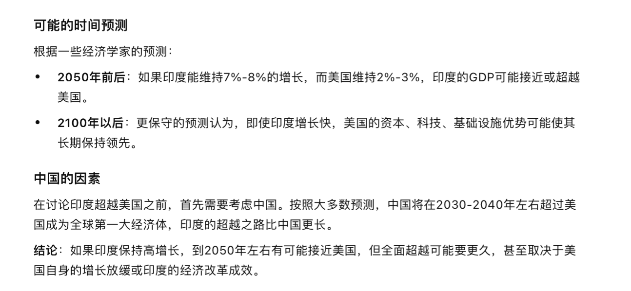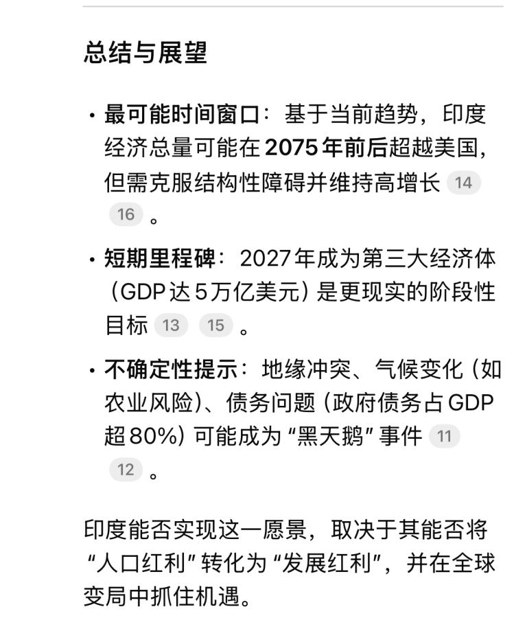 股市是一方面,而印度的经济前景如何,是另一个方面。目前总量世界排名第五的印度经济,仅仅看一个统一市场的人口构成,三哥无疑是小伙子睡凉炕全凭火力旺。以目前的势头用不了多少年,印度就能达到一般一般世界第三的地位,然后前面就是两座难以逾越的大山(2024年印、日、德GDP分别是4.27万亿、4.39万亿与4.92万亿)。至于是否能更进一步(2024年第二的中国是18.8万亿,领先很多),这种事比较难说,但无疑其体量庞大,人口又是全球第一,人口素质也在飞速提升,产业发展里新兴产业的比重很大,时间拉长了,其冲击前二的希望不能说没有,甚至也很大。