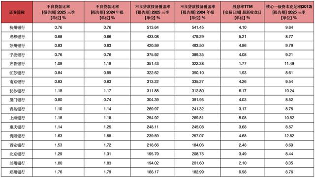 北京银行、兰州银行和郑州银行的拨备覆盖率排名靠后,其中,北京银行、兰州银行的拨备覆盖率分别为195.79%、194.02%,分别较上年末下降12.96个百分点、7.58个百分点。郑州银行的拨备覆盖率为186.17%,较上年末增长3.18个百分点。