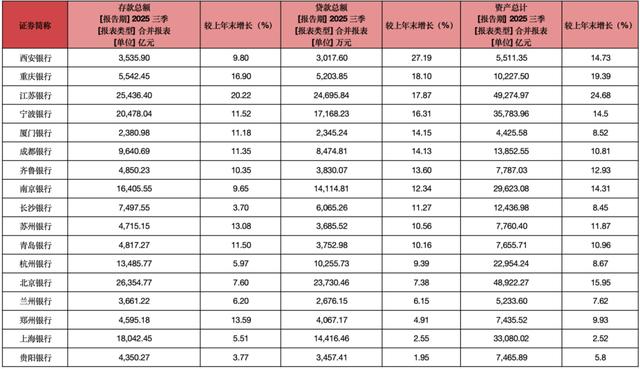 从贷款情况来看,2025年前三季度,有11家增速在10%以上,有4家增速在15%以上,其分别为西安银行、重庆银行、江苏银行和宁波银行,贷款总额分别为3017.60亿元、5203.85亿元、24695.84亿元、17168.23亿元,较上年末增长27.19%、18.10%、17.87%和16.31%。