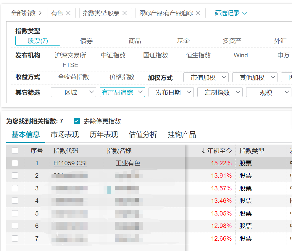 该指数前三大金属行业为铜(29.2%)、铝(26.7%)、稀土(15.3%),合计占比近70%,相对有色金属指数,工业有色不含新能源锂,黄金占比(6%)较小。前十大成分股涵盖洛阳钼业、北方稀土、中国铝业、江西铜业等行业龙头。