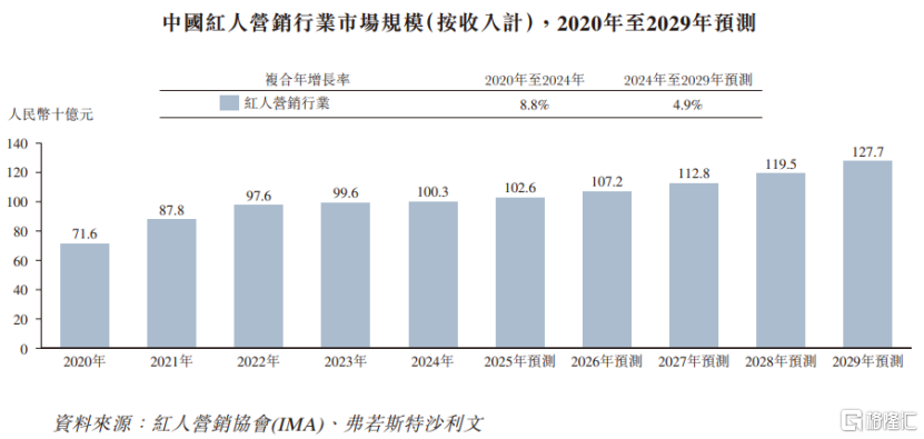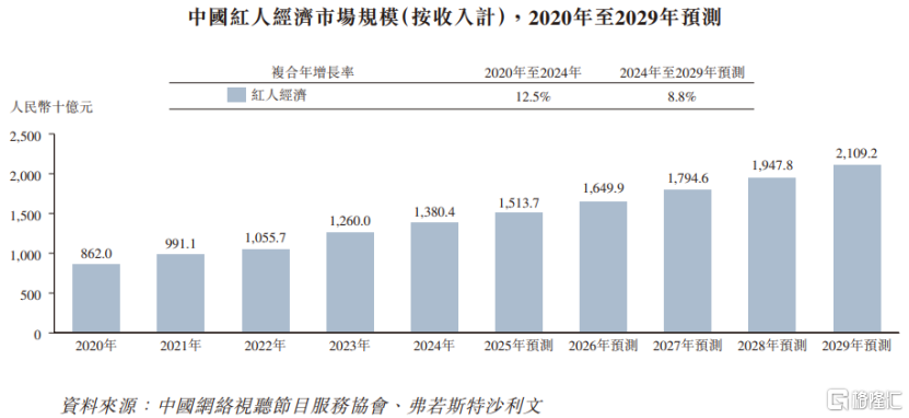 2024年中国红人经济规模约1.38万亿元,预计到2029年将扩大至2.11万亿元,2024年至2029年的复合年增长率为8.8%。