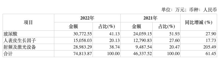 射频激光这一类微整形项目拥有创伤小、见效快、性价比高等特性,相比填充类的玻尿酸产品,射频类产品更易于被求美者接受,一个疗程一般需要5-6次治疗,并且每1-2月进行一次,因此消费频率更高,可以迅速提升公司营业收入。但是射频及激光设备前期需要高额的固定设备投入,因此其毛利率显著低于玻尿酸以及外用表皮生长因子业务,因此2022年医美业务收入快速提升61.45%的同时其毛利率反而下降了4.29%