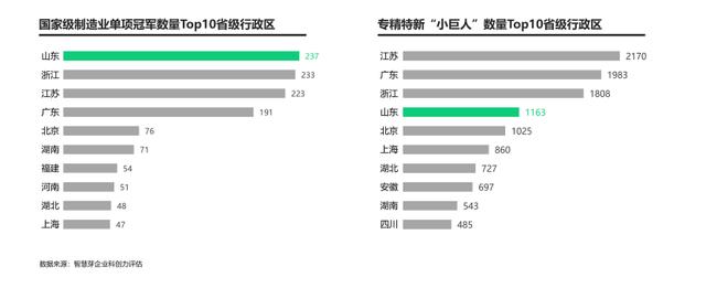 在专精特新“小巨人”数量上,全国六批“小巨人”中,山东共有1163家,位列全国第四。其中,新材料和高端机械装备企业占五成以上。值得一提的是,来自青岛、济南、烟台、潍坊四市的专精特新“小巨人”共有595家,占全省半数以上。