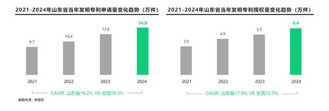 从增幅看,2021-2024年间,全国发明专利申请量三年增速、发明专利授权量三年增速分别为18.3%、15.5%,而山东省则为19.2%、17.9%,均高于全国水平。