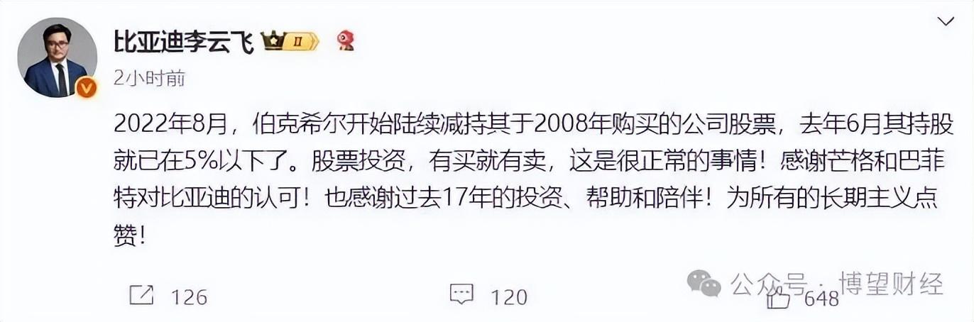 伯克希尔的一位发言人证实,比亚迪的全部持仓确实已被出售。
