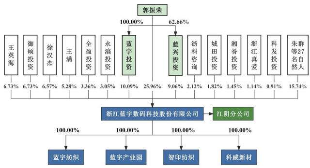 本次上市前,蓝宇股份的控股股东、实际控制人均为郭振荣,合计控制公司45.11%的股权。据招股书披露,郭振荣通过蓝宇投资控制该公司10.0888%股份,通过蓝兴投资控制该公司9.0636%股份,合计控制该公司45.1127%的股份。