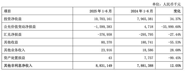 在其它非利息收入中,投资净收益为107.03亿元,同比增长34.37%;公允价值变动(损失)/收益-15.99亿元,而上年同期为471.8万元;汇兑净损益为-3.77亿元,同比下降27.44%。