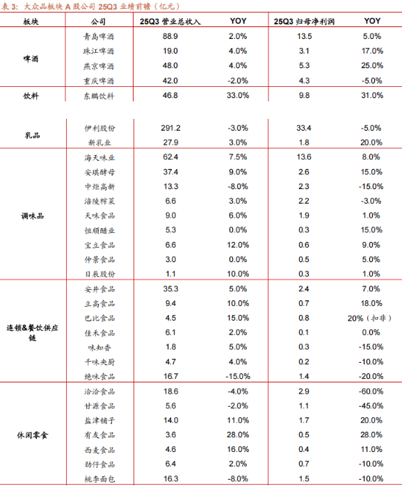 短保面包、卤味需求偏弱,桃李预计收入个位数下滑,绝味单店同比仍有缺口。利润端,成本同比略有压力,企业利润表现分化。
