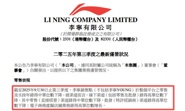 近年来,曾经风光无限的“国潮一哥”李宁,面临明显的业绩压力,归母净利润连续两年下滑。最新2025年三季度运营情况显示,公司线下渠道零售流水出现高单位数下滑,而电子商务虚拟店铺业务录得高单位数增长。