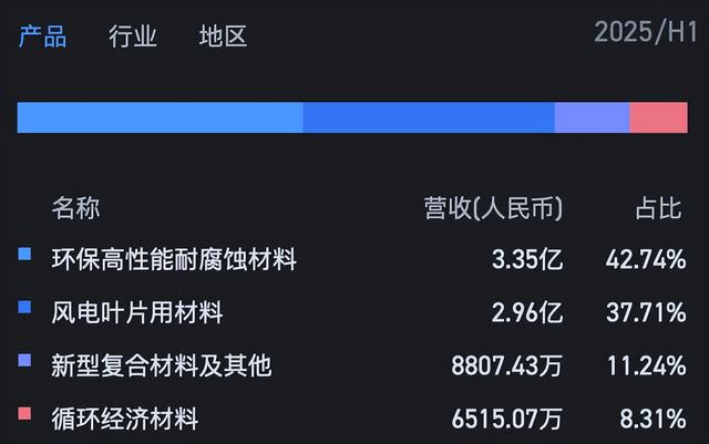 进一步拆分营收结构,目前该公司业务主要包括环保高性能耐腐蚀材料、风电叶片用材料、新型复合材料以及循环经济材料四大部分,其中前两者是公司最大的收入支撑。