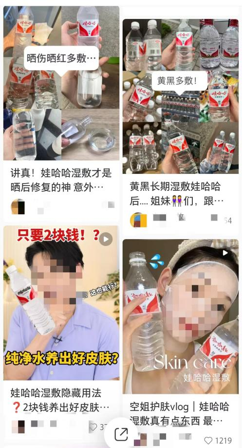 如果食物敷脸会引发各类风险,那么纯洁水、矿泉水这类更“纯净”的物质,是否能将风险减少,更适合敷脸和洗脸呢?网友们和博主们自然也想到了,不难发现,用纯洁水、矿泉水敷脸的方法一直在互联网上流传。