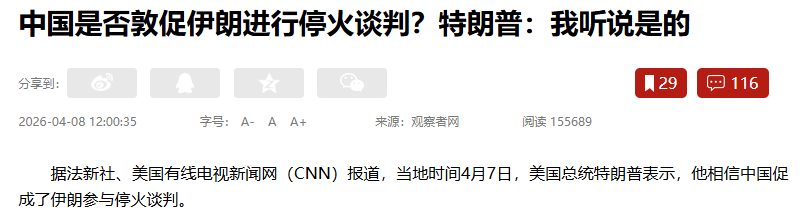 据报道,当地时间4月7日,美国总统特朗普表示,他相信中国促成了伊朗参与停火谈判。