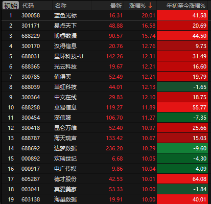 刚好AI应用、国产算力调整了不少,今天全线暴涨,蓝色光标、电广传媒、海量数据、真爱美家、德才股份等多只AI应用概念股涨停,国产算力这边,数据港、利通电子、润建股份、开勒股份、平治信息、浙文互联、大位科技等多只股票涨停。