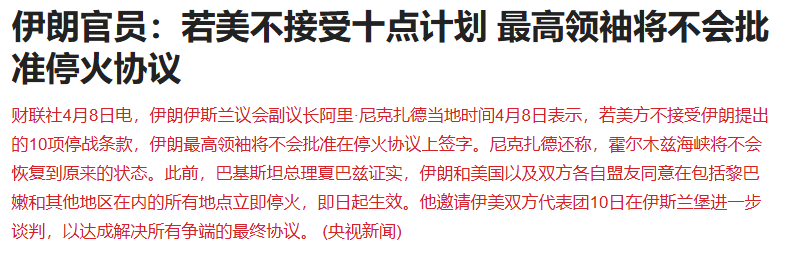 伊朗伊斯兰议会副议长阿里·尼克扎德当地时间4月8日表示,若美方不接受伊朗提出的10项停战条款,伊朗最高领袖将不会批准在停火协议上签字。
