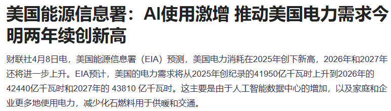 美国能源信息署(EIA)预测,美国电力消耗在2025年创下新高,2026年和2027年还将进一步上升。EIA预计,美国的电力需求将从2025年创纪录的41950亿千瓦时上升到2026年的42440亿千瓦时和2027年的 43810 亿千瓦时。