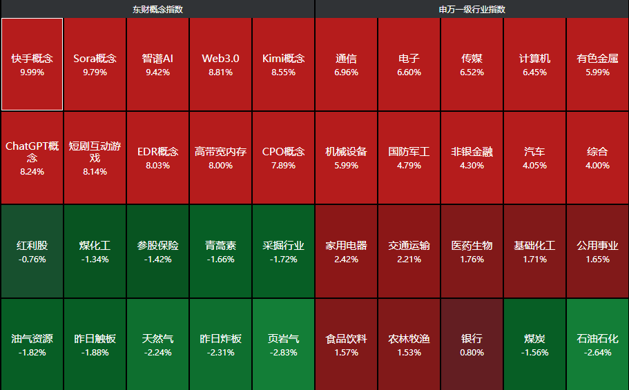 分行业来看,通信、电子、传媒、计算机、有色金属等行业领涨,石油石化、煤炭下跌。