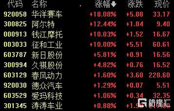 摩托车概念走高,华洋赛车涨超18%,阿尔特涨超12%,钱江摩托、征和工业10cm涨停,新日股份春风动力等跟涨。