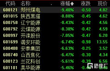 煤炭股下挫,郑州煤电跌超9%,陕西黑猫辽宁能源云煤能源跌超8%,山西焦化兰花科创等跟跌。