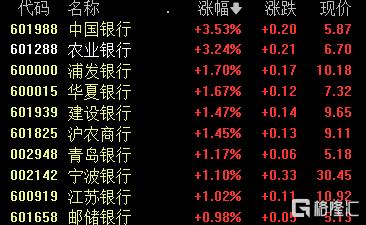 银行股集体上涨,中国银行农业银行涨超3%,浦发银行华夏银行建设银行等跟涨。