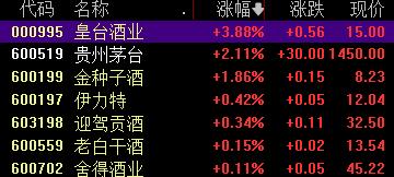 白酒股高开低走,皇台酒业涨超3%,贵州茅台涨超2%,金种子酒伊力特小幅上涨,山西汾酒古井贡酒跌超2%。
