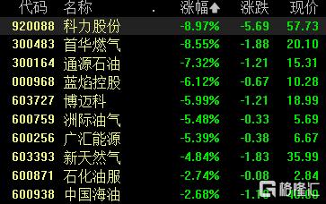 油气股大跌科力股份首华燃气跌超8%,通源石油跌超7%,蓝焰控股博迈科洲际油气等跟跌。