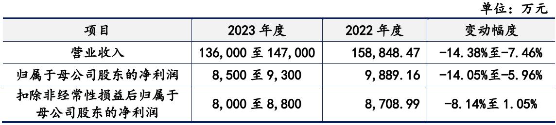 同时,强邦新材预计其2023年度的收入约13.6亿元至14.7亿元,同比变动-14.38%至-7.46%;净利润8500万元至9300万元,同比变动-14.05%至-5.96%;扣非后净利润8000万元至8800万元,同比变动-8.14%至1.05%。