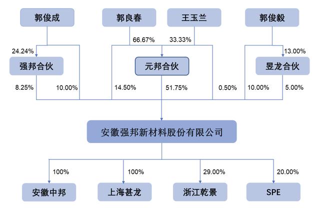 本次上市前,强邦新材的控股股东为元邦合伙,持股51.75%。据招股书披露,以郭良春为核心的家族成员为该公司实际控制人,其中郭良春、王玉兰夫妇通过元邦合伙持股51.75%,郭良春和王玉兰夫妇及其子郭俊成和郭俊毅直接持股35.00%。
