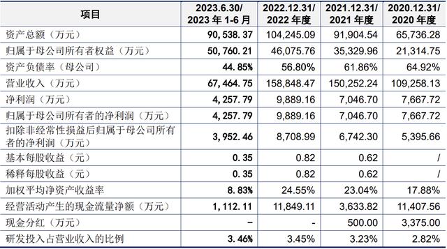 2020年、2021年、2022年和2023年上半年,强邦新材的收入分别为10.93亿元、15.03亿元、15.88亿元和6.75亿元,净利润分别为7667.72万元、7046.70万元、9889.16万元和4257.79万元,扣非后净利润分别为5395.66万元、6742.30万元、8708.99万元和3952.46万元。