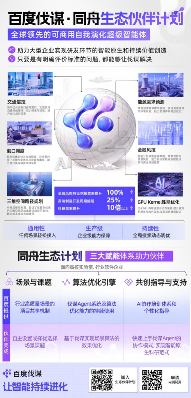 为了进一步加速AI在千行百业的渗透,让顶尖算法工程师将成为企业和科研标配,百度伐谋正式发布“同舟生态伙伴计划”,面向高校实验室、行业软件企业,开放高质量行业场景与课题,共享伐谋Agent系统及算法优化引擎,并提供AI协作培训与个性化服务指导。对于高质量伙伴的科研创新或产业实践项目,百度伐谋将提供全面免费支持。