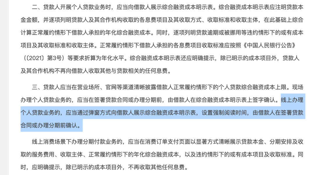 这里面明确提到:线上办理个人贷款业务的,应当通过弹窗方式向借款人展示综合融资成本明示表,设置强制阅读时间,由借款人在签署贷款合同或办理分期前确认。