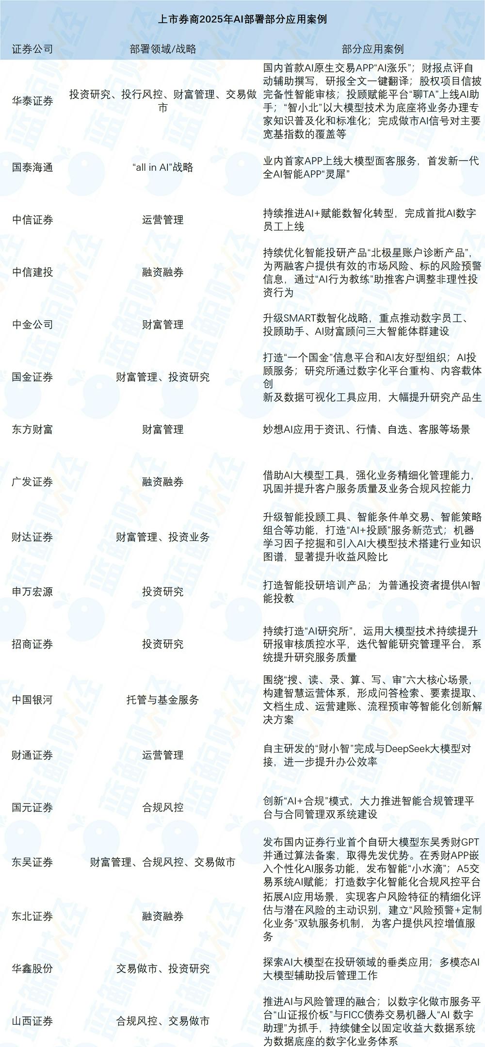 一些券商根据自身禀赋和业务发展需要,选择将AI应用在合规风控、运营管理、托管等不同领域。其中,广发证券、中信建投、国元证券、山西证券、东北证券将AI的应用场景拓展至合规风控领域,助力AI与风险管理的融合;财通证券、中信证券推进AI赋能运营管理,提升办公效率;中国银河则将AI嵌入到托管与基金服务当中。