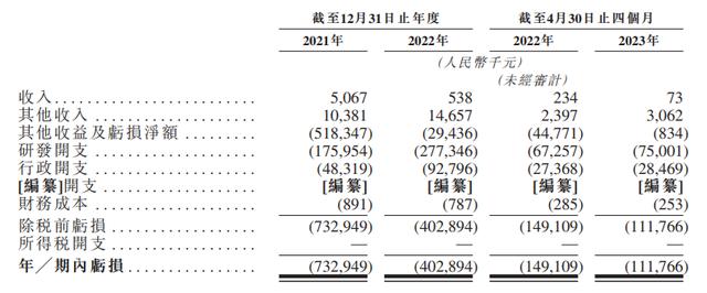 2021年和2022年,宜明昂科的净亏损分别为7.33亿元和4.03亿元,2023年前四个月的亏损为1.12亿元。按非国际财务报告准则计量,该公司2021年、2022年和2023年前四个月的调整亏损分别为1.83亿元、2.26亿元和6964.1万元。