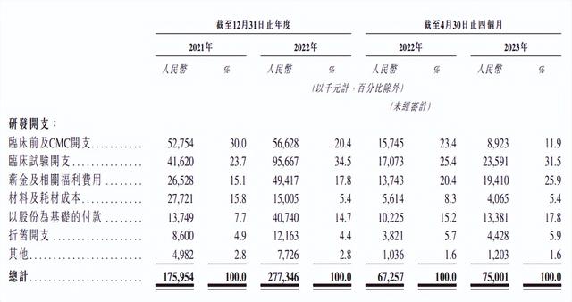 宜明昂科在招股书中称,亏损的主要原因是该公司持续推进的药物研发和不断扩大的临床团队。2021年和2022年,宜明昂科的研发开支分别为1.76亿元和2.77亿元;2023年前四个月的研发费用为7500.01万元,较2022年同期亦有所增长。