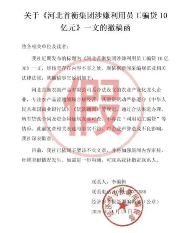 就在首衡集团骗贷疑云持续发酵之际,部分网络媒体于2025年11月收到了一份特殊的“撤稿函”。该函件落款为“经济参考报新闻编辑部”,明确要求撤回《河北首衡集团涉嫌利用员工骗贷10亿元》一文,试图以权威媒体的名义平息争议。但这一拙劣的伪造行为,很快被真正的《经济参考报》识破。