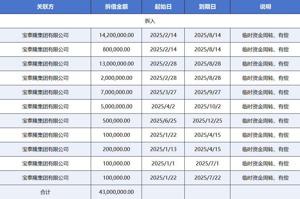 其中,2024年年报显示,宝泰隆集团拆入上市公司资金共计1.5亿元,均于2025年1月25日到期,性质为“临时资金周转、有偿使用”;2025年上半年,宝泰隆集团拆入上市公司的资金合计4300万元,相关款项于2025年12月25日到期,同样被描述为“临时资金周转、有偿”。