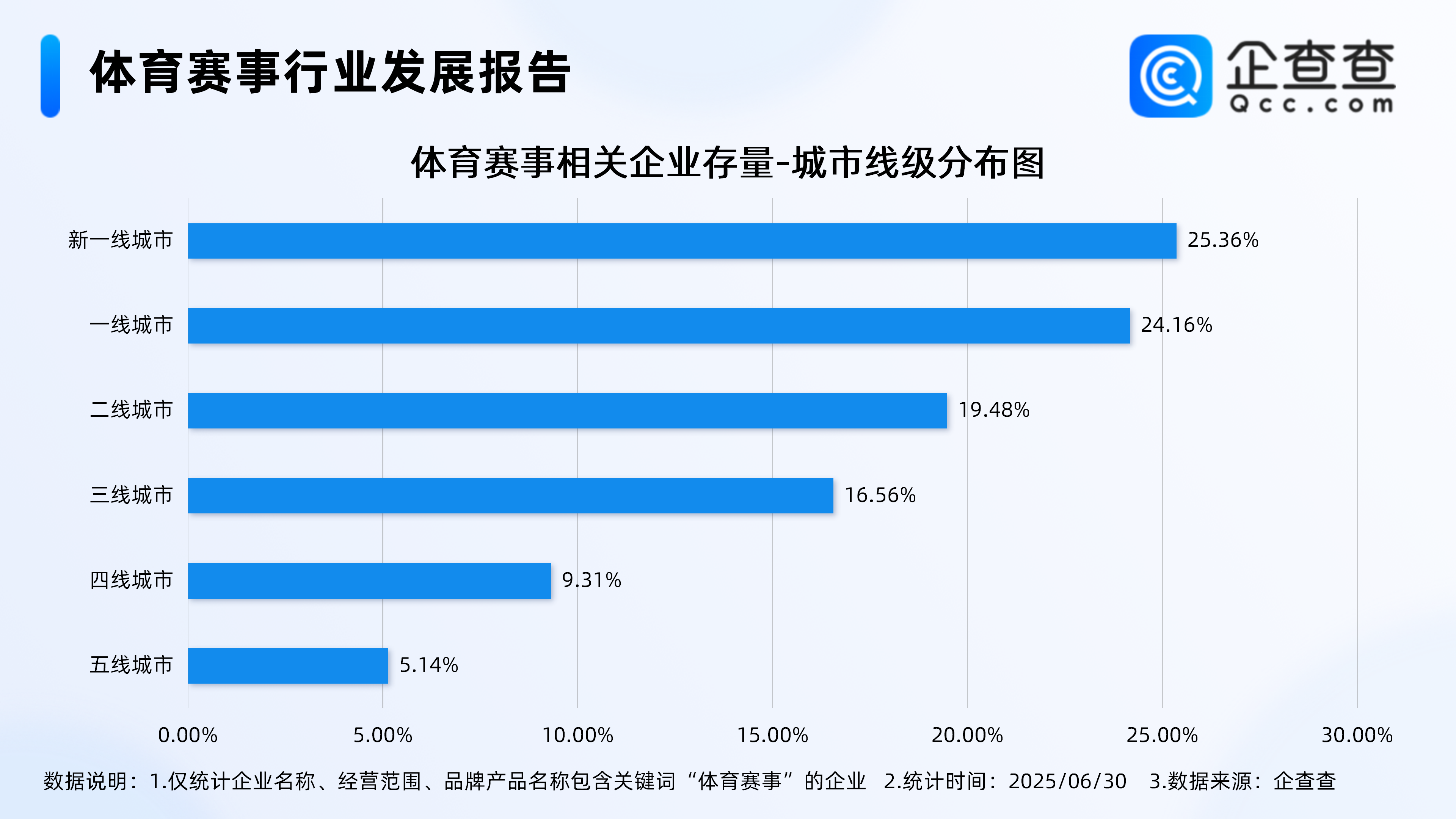 企查查数据显示,从城市线级分布来看,体育赛事相关企业多分布在新一线城市、一线城市,占比分别达25.36%、24.16%。此后,相关企业存量随城市线级递增而减少,二线城市、三线城市相关企业存量分别占比19.48%、16.56%。