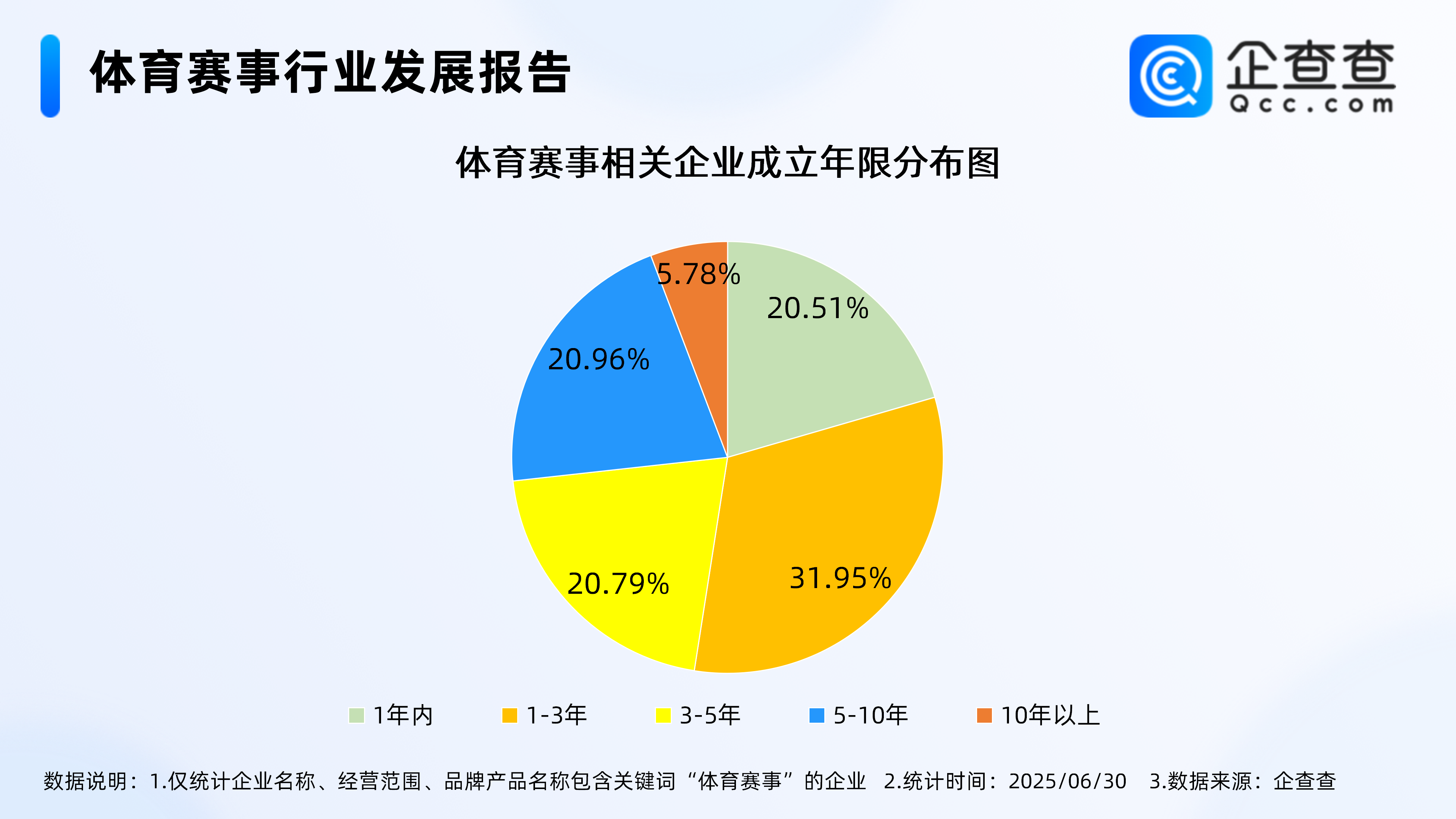 企查查数据显示,从经营时间来看,成立年限在1-3年的体育赛事相关企业最多,占比达31.95%。此外,成立年限在1年内、10年以上的相关企业分别占比20.51%、5.78%。