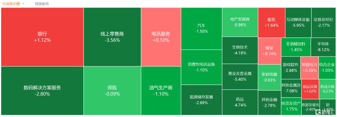 盘面上,作为市场风向标的大型科技股集体下跌,现货黄金白银短线跳水,黄金股领衔有色金属股下跌;昨日强势的半导体芯片股大幅下挫;濠赌股、生物医药股、苹果概念股、钢铁股、军工股、中资券商股纷纷下跌。另一方面,内银股逆势上涨,影视股、海运股、内险股部分上涨,尤其是欢喜传媒大涨近20%表现抢眼。