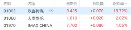 影视娱乐股表现活跃,欢喜传媒涨超19%,大麦娱乐涨超2%,IMAX CHINA涨超1%。