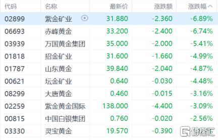 黄金股及贵金属股高开低走,紫金矿业、赤峰黄金跌超6%,万国黄金集团跌超5%,招金矿业、大唐黄金等跟跌。