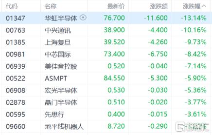 芯片、半导体股全线走低,华虹半导体跌超13%,中兴通讯跌超10%,上海复旦跌超9%,中芯国际、晶门半导体等跟跌。
