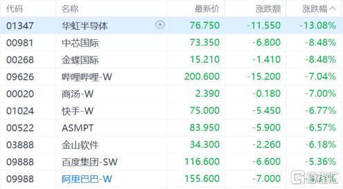 大型科技股普跌,华虹半导体跌超13%,中芯国际、金蝶国际跌超8%,哔哩哔哩-W、商汤-W跌超7%,快手-W、金山软件等跟跌。